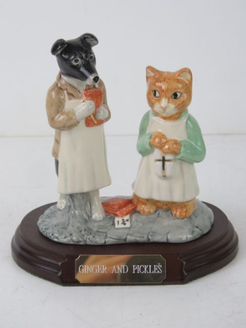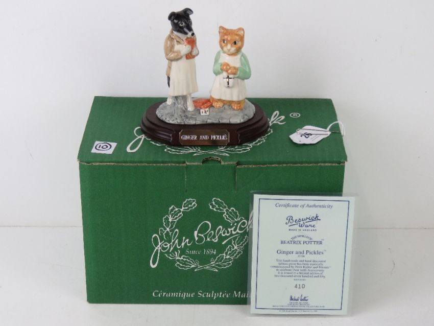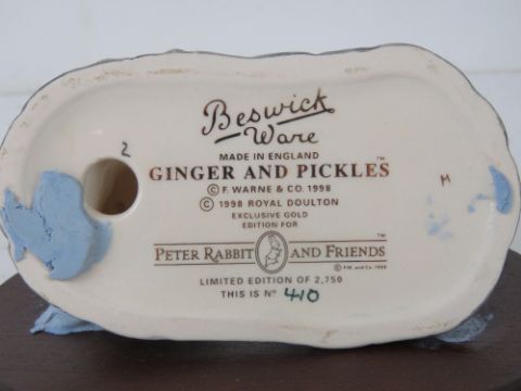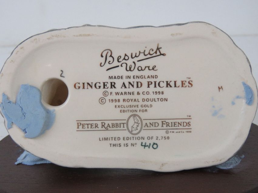Royal Doulton Beswick Ware Beatrix Potter; 'Ginger and Pickles' P3790 Limited Edition tableau to celebrate 'Peter Rabbit and Friends TM' 10th Anniversary, produced for The Royal Doulton International Collector's Club No 410. With box and certificate. Approx 10.5cm wide.