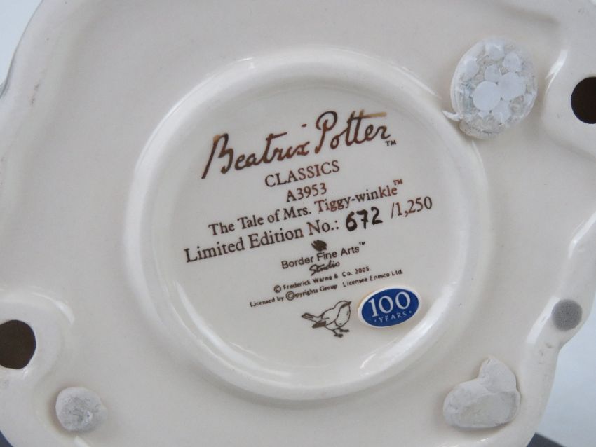 Border Fine Arts, Beatrix Potter; 'The Tale of Mrs Tiggy-Winkle', Limited Edition for 100 Year Mrs Tiggy-Winkle, no 672, approx 13cm wide with box and certificate.