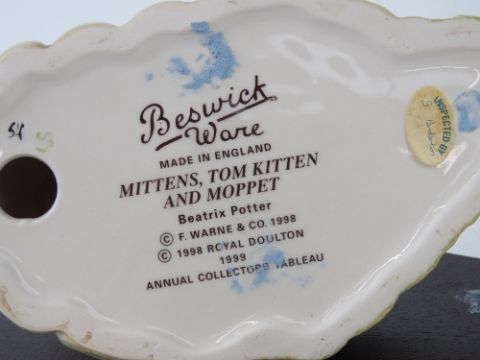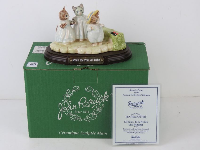Royal Doulton Beswick Ware, Beatrix Potter; 'Mittens, Tom Kitten and Moppet', modelled by Amanda Hughes-Lubeck, for The Royal Doulton International Collector's Club, 1999 Annual Collector's tableau P3792, with box and certificate, approx 17cm wide.