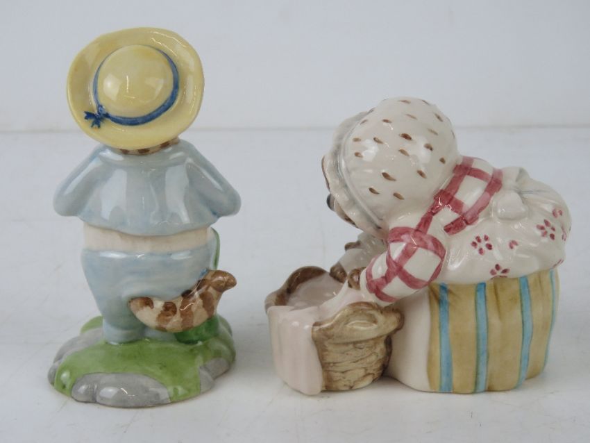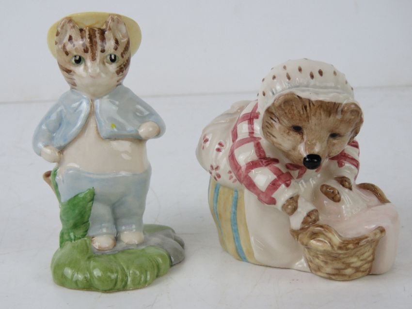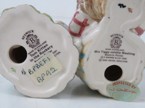 Royal Doulton Beswick Beatrix Potter; Two boxed figurines having brown 'B' shield backstamp, being 'Mrs Tiggy-Winkle Washing' and 'Tom Kitten in the Rockery'. Two items.