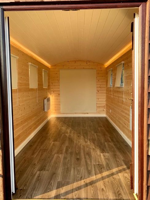 Cloaked in pressure-treated and sustainable feather-edge, with internal Tyvec breathable membrane, Celotex insulation throughout, Thermawrap to the ceiling with traditional repurposed Zinc roofing sheets and finished in tongue & groove within and cushioned oak-effect washable vinyl flooring.