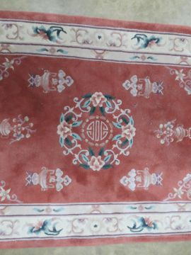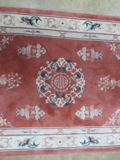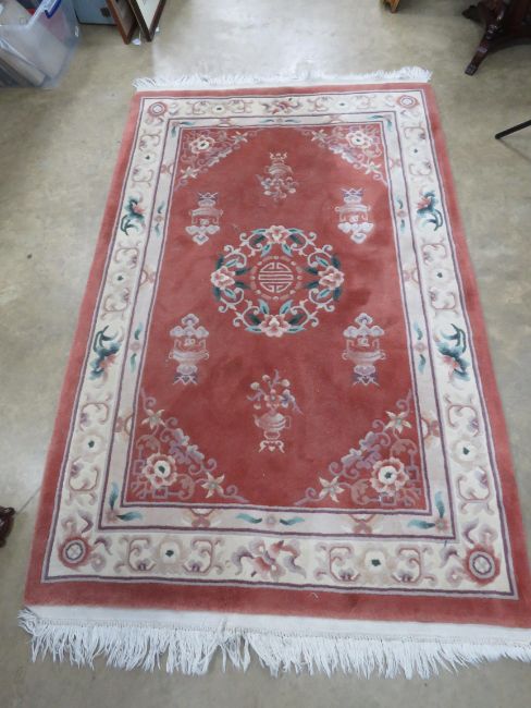 A terracotta ground woollen rug having Oriental style foliate pattern in green, purple and cream, 207 x 122cm.