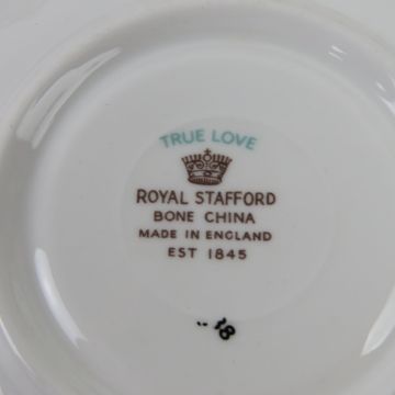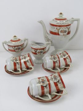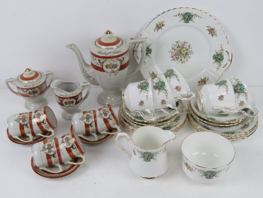 Two part tea services, one by Royal Stafford comprising cake plate, milk jug, sugar bowl and trios, the other in orange and cream ground.