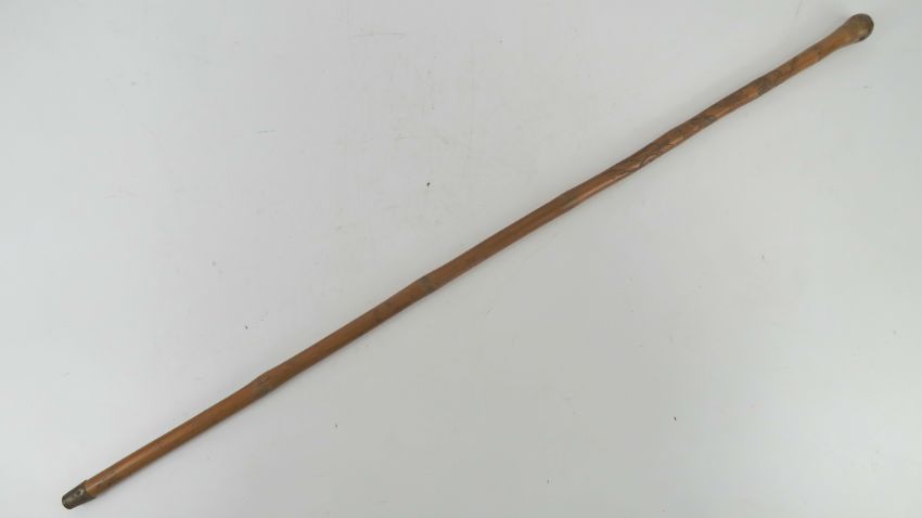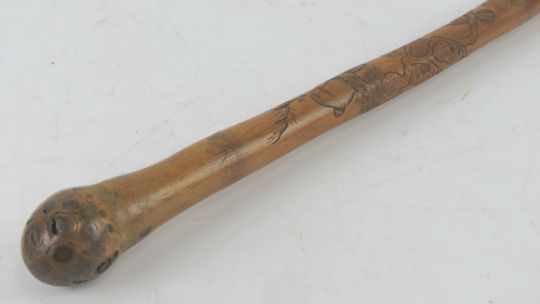A bamboo swagger stick carved with birds and monkeys upon, 87cm in length.
