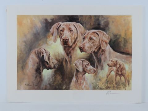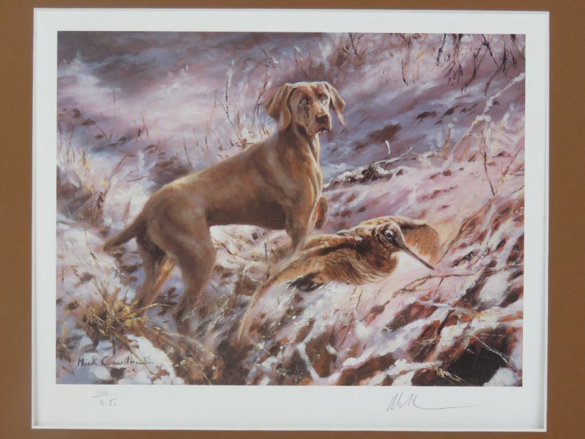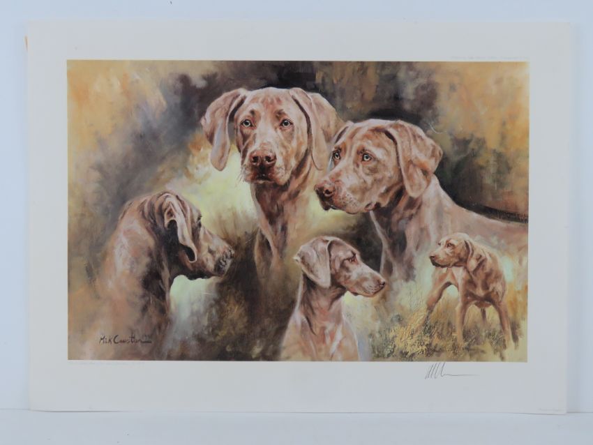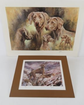 Two signed limited edition Mick Cawston prints of Weimaraners, the larger being No 566/850, signed in pencil lower right, sight size 59 x 38.5cm, the other being No 114/850, signed in pencil lower right, mounted, sight size 27.5 x 21cm.