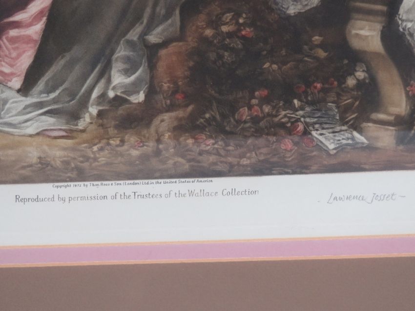 A framed print from a painting in the Wallace Collection depicting a Georgian lady carving her name upon a tree, dog watching on, 62 x 76cm.