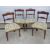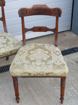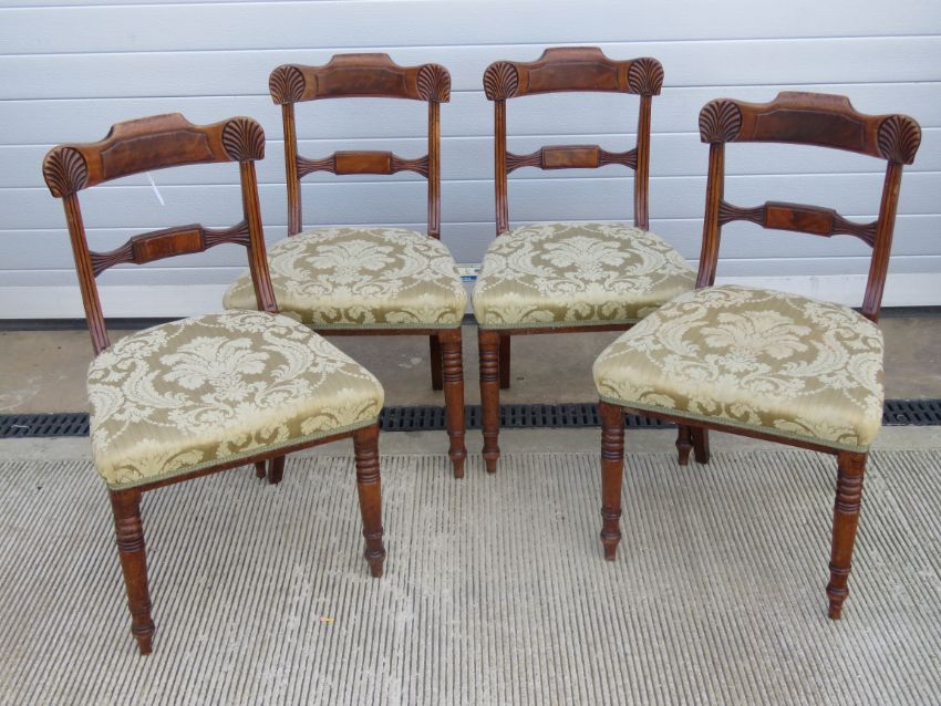 A set of four late 19th century mahogany framed dining chairs having double splat and ring turned legs.