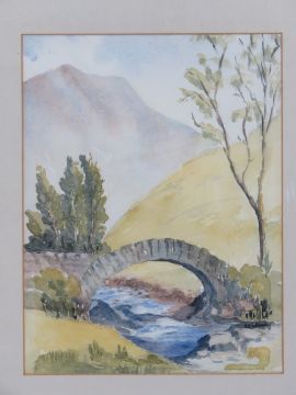 Watercolour by Eve Watson 'Pack horse bridge', signed lower right, 31.5 x 24cm, framed and glazed.