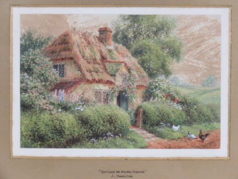 A pair of watercolours by J Hamilton entitled 'Cottage Nr Malpas, Cheshire' and 'Cottage Nr Lancaster', each being countryside scene with thatched cottage to centre. Each being 26.5 x 17.5cm having gilt mounting slip and slightly a/f gilded frames.