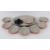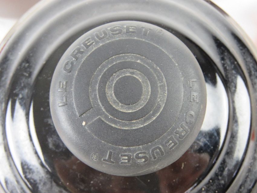 Le Cruset; a large oval oven dish together with a set of eight individual dishes and a teapot lid.