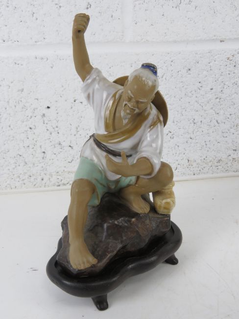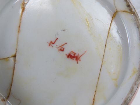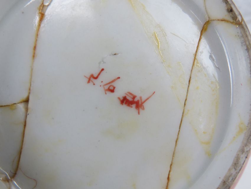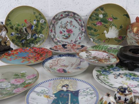 A Satsuma heavily repaired ginger jar and cover, a quantity of 19th/20th century Oriental plates, an Oriental export three piece condiment set and a hardwood stand.