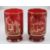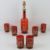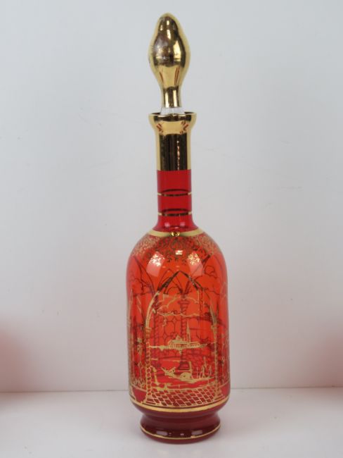 A Venetian ruby glass decanter set having six glasses, all having gilded scene and decoration upon, possibly Murano, decanter standing 37cm high.