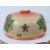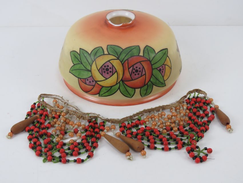 An early 20thC hand painted milk glass light shade marked 'Folly' upon, slightly a/f. Together with a hand made beaded fringe possibly Welsh.