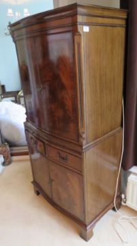 A reproduction Georgian style illuminated drinks cabinet, twin doors opening to reveal compartment within over slide, twin drawers and further doors, 70 x 44 x 151cm.