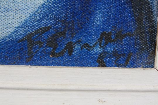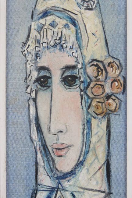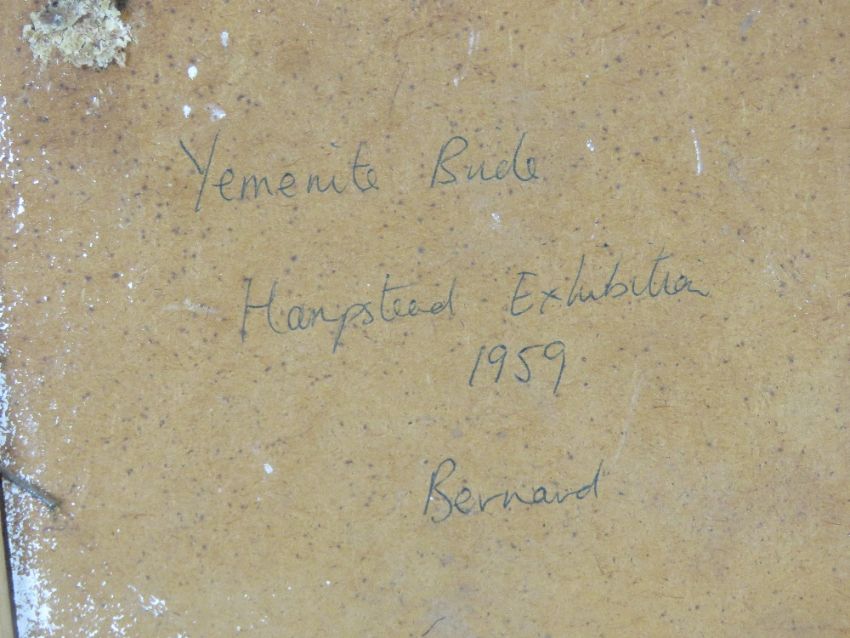 Acrylic on canvas on board; entitled Yemenite Bride with inscription verso 'Hampstead Exhibition 1959 Bernard' signed lower right (illegible), sight size 55 x 14cm, in white painted frame.