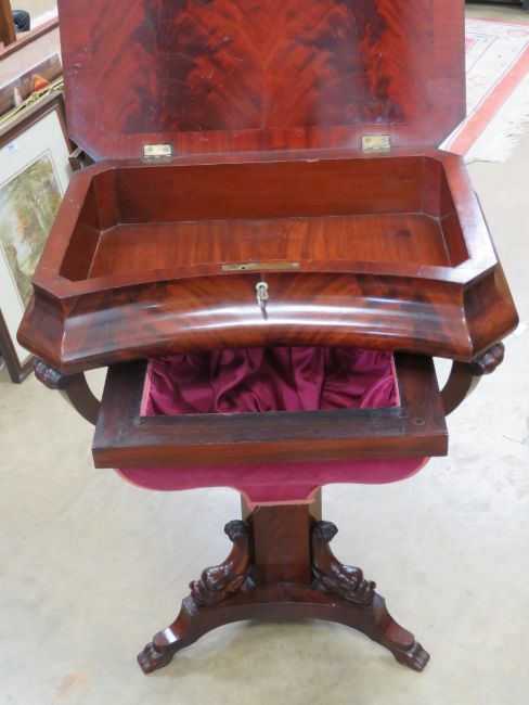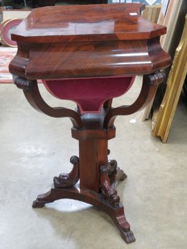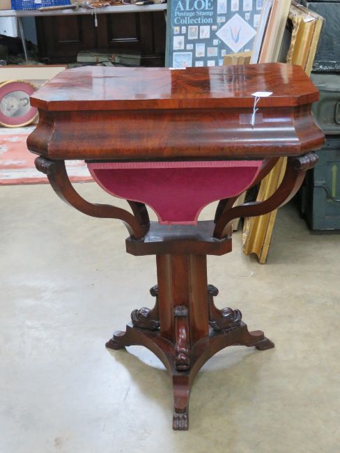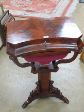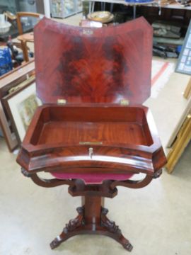 A good half veneered walnut work table having flame mahogany top, opening to reveal compartment within, pull-out satin lined drawer under, all raised over triangular columnar base. 56 x 41 (max) x 73cm.