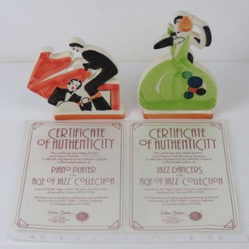 A pair of Jazz figurines by Past Times entitled 'Piano Player and Jazz Dancers' inspired by Clarice Cliff designs, with certificates.