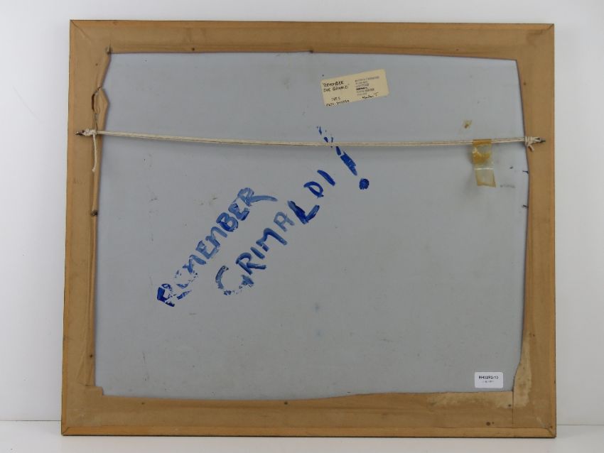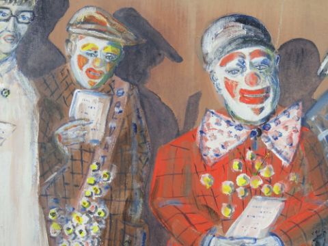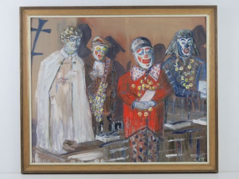 Oil on board entitled 'Remember Joe Grimaldi!' featuring clowns and a robed man by Martin Trowbridge, 58 x 48cm, framed.