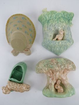 A quantity of assorted ceramic wall pockets; two Sylvac pockets one having imp upon, one having rabbit upon, and Brentleigh ware 'bonnet'. Together with a possibly Sylvac trinket pot with dog lying on slipper. Four items.