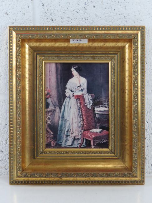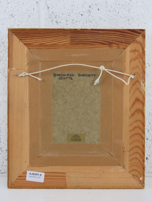 Print entitled 'Baroness Burdett Coutts', pensive lady in lace shawl with mourning jewellery, 19 x 14cm in gilt frame.