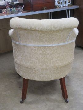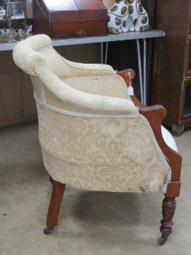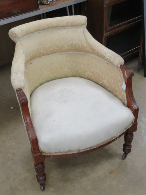An Edwardian tub chair for re-upholstering having ceramic castors.