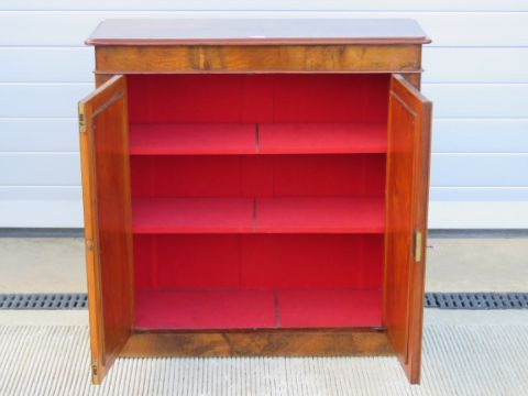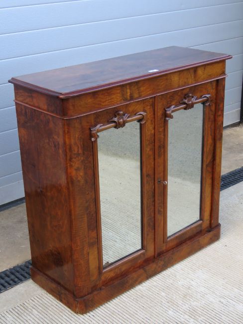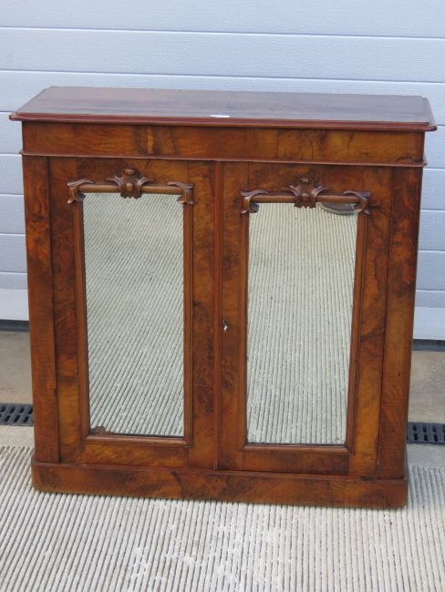 A good walnut half veneered two door floor standing cabinet, twin mirrored doors opening to reveal baize lined shelves within, with key. 88 x 34 x 88cm.