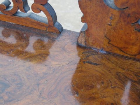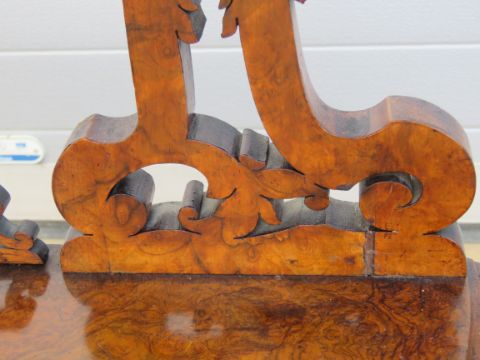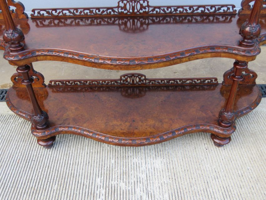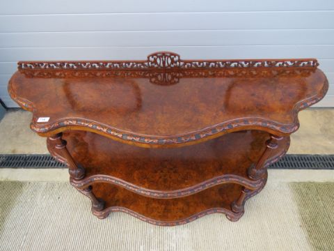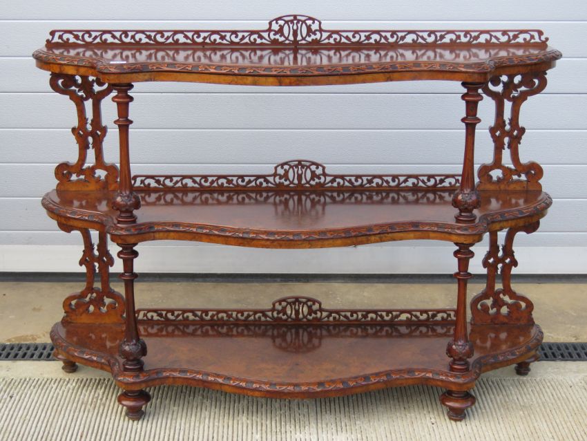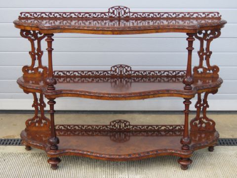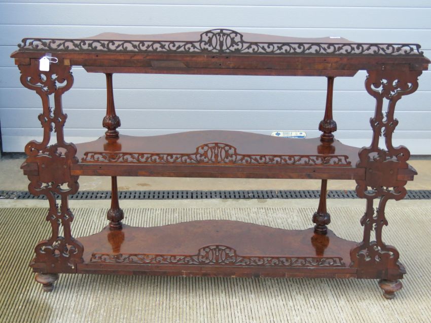 A fine 19thC walnut three tier open fronted buffet or credenza having shaped shelves in fine figured walnut, blind carved to the fore, fretted to the rear and all raised over shaped balusters. 142 x 43 x 102cm.