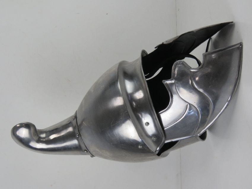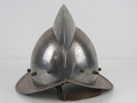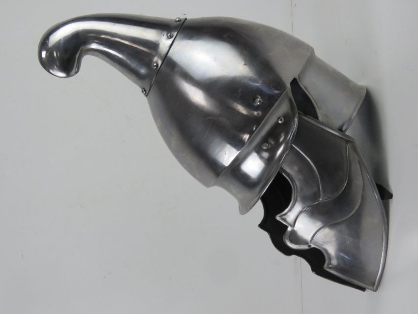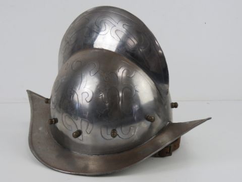Two reenactor or display pieces: A Spanish 16th century style helmet and a medieval knights style helmet.