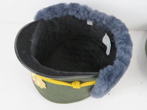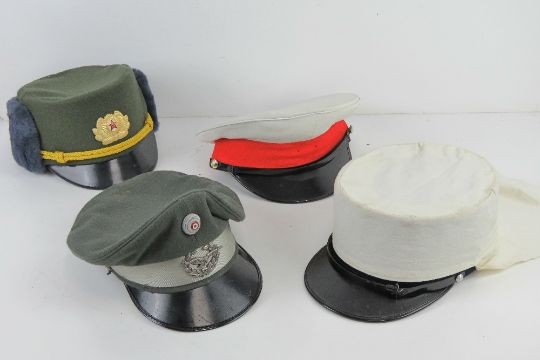 A Royal Marine dress cap (no badge, size 55), a French Foreign Legion Kepi (size 58 ½), a Russian winter cap and an Austrian Air Force dress cap (size 57).