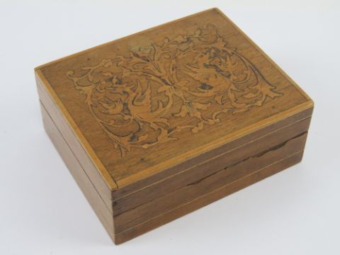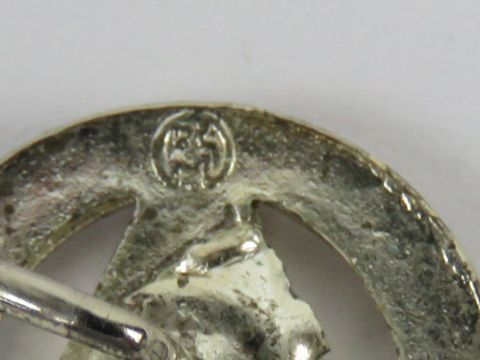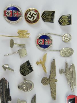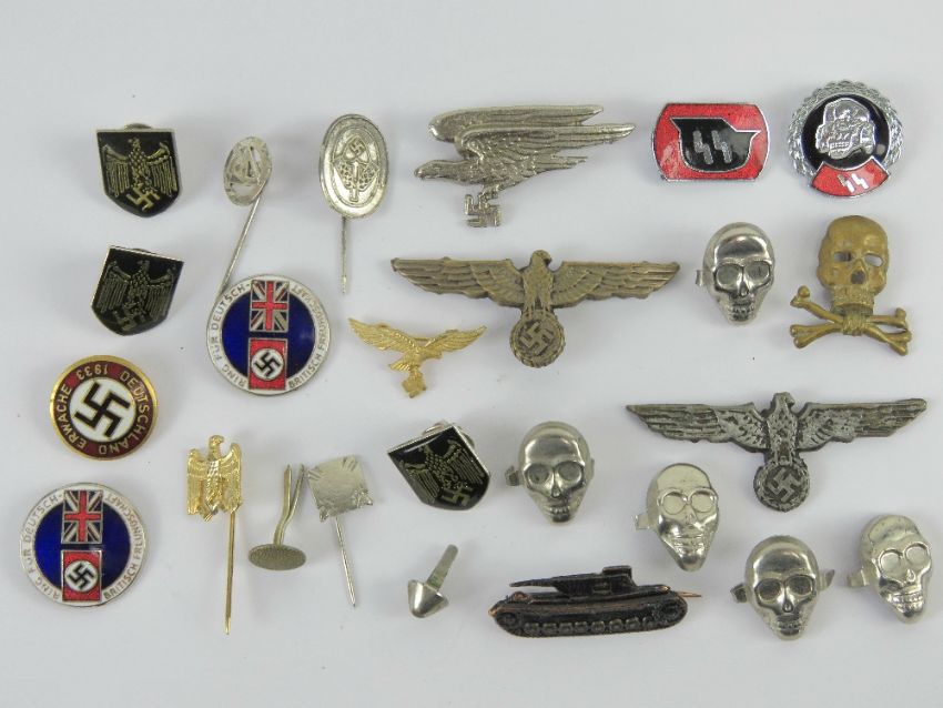 A small wooden box containing reproduction German WWII badges and insignia (25 pieces).