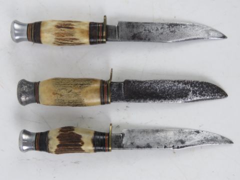 Three fighting knives having antler handles.