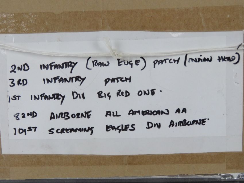 A framed montage of WWII US cloth patches. Together with a framed WWI POW letter signed by King George. Two items.