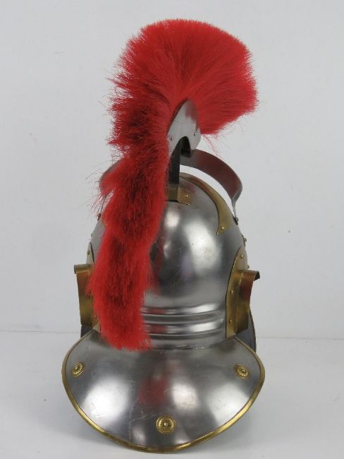 A reenactor or display piece Roman Centurion helmet having red plume upon.