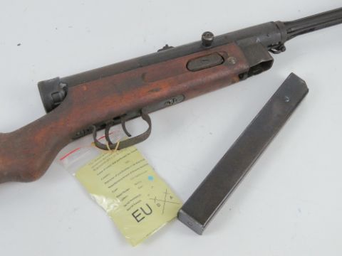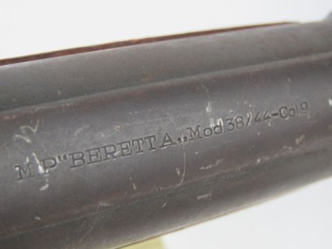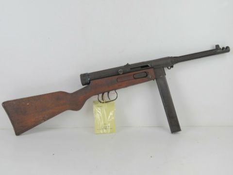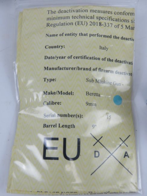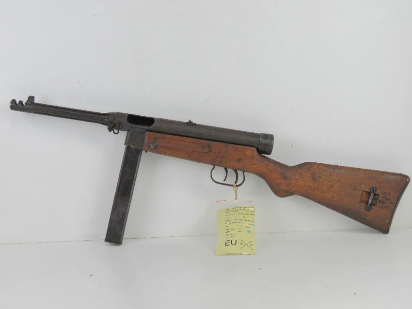 A deactivated WWII Beretta Mod. 38/44 Sub Machine Gun, with moving metal dummy bolt (under spring pressure), moving triggers, safety and removable magazine. With a new spare stock, two magazines, magazine pouch and strap, oil bottle, cleaning rod, sling, and five inert rounds. EU Cert.