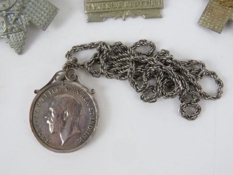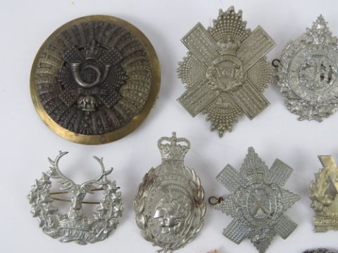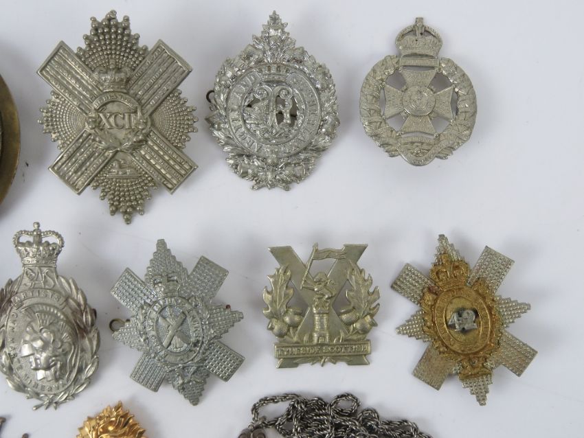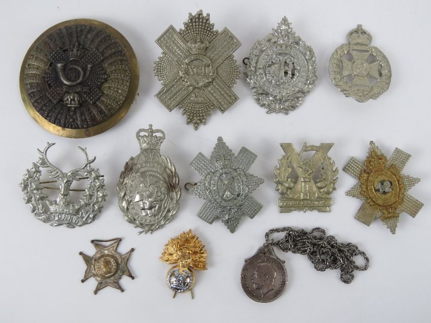 A quantity of assorted large size British regiment cap/helmet badges, approx 11 items, inc Artist's, Argyle and Sutherland, The Prince Consort's Own, Tyneside Scottish etc. Together with a WWI War Medal in pendant mount on chain. Twelve items in total.
