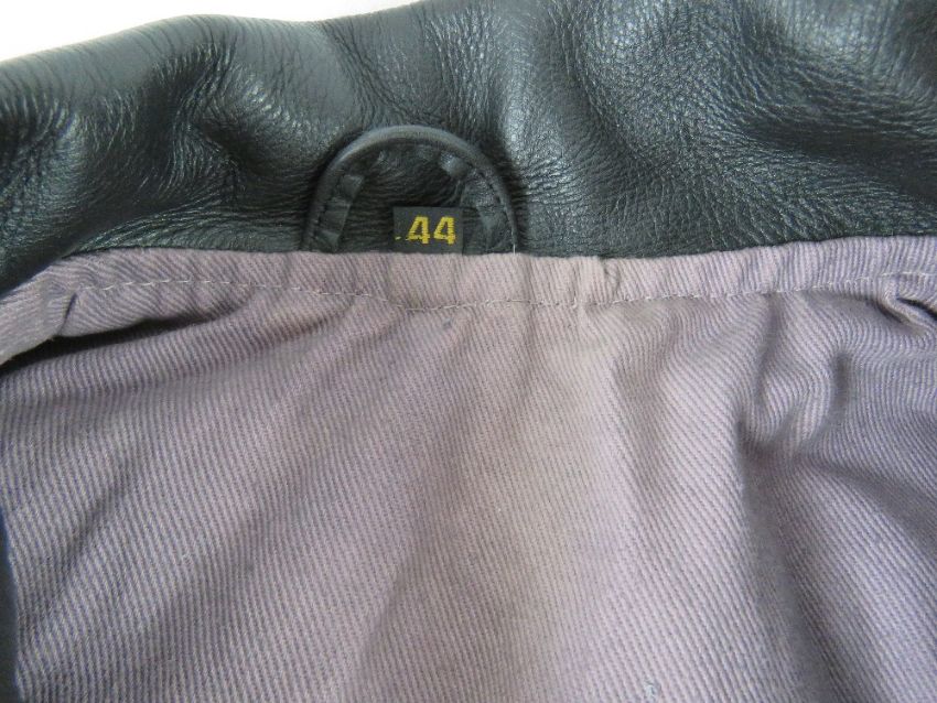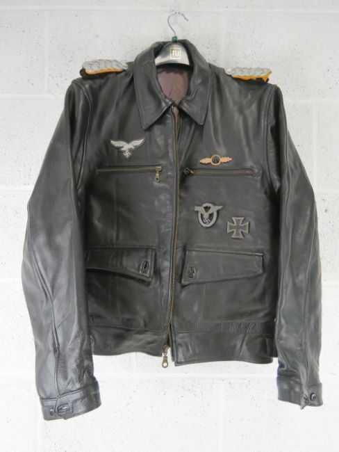 A repro WWII German Luftwaffe leather jacket (size 44) with awards and silk scarf.