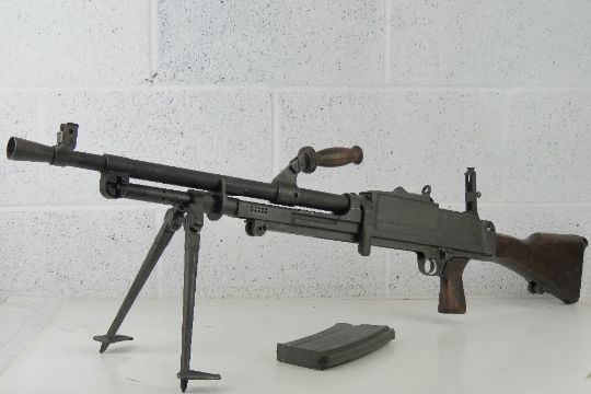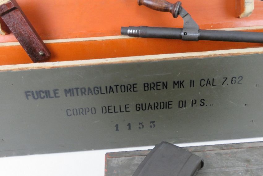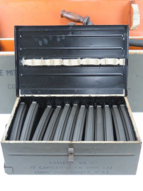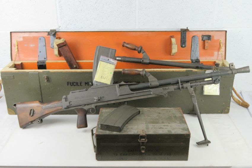 A deactivated Italian Breda Bren .30-06 Calibre Light Machine Gun. Matching Numbers, BMB - Breda Meccanica Brescia manufacture and post war dated. In original Transit Chest, with Spare matching number Barrel, and twelve Magazines in Box. Moving trigger, selector, cocking handle (under spring pressure). With EU certificates for gun and spare barrel.