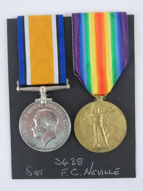 A WWI British War and Victory Medal pair, Norfolk Regiment, Sgt F.C.Neville 3438 medals. Together with medal roll index card for Frederick C Neville.