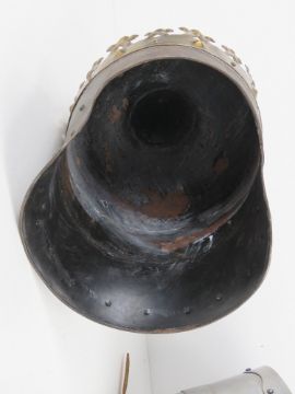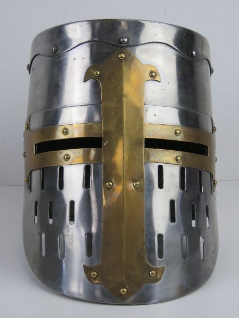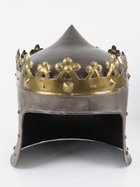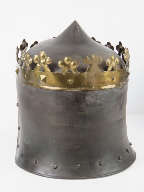 Two reenactor or display pieces; a Medieval knight helmet and a King Richard the Lion heart helmet.