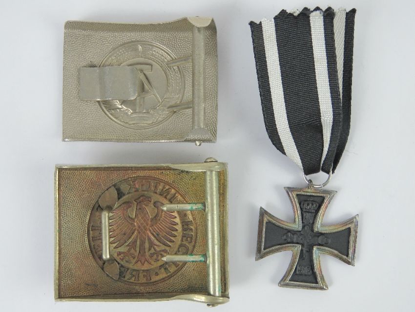 A quantity of reproduction militaria; 1x Russian Belt Buckle, 1x German Belt Buckle, 1x Iron cross.