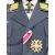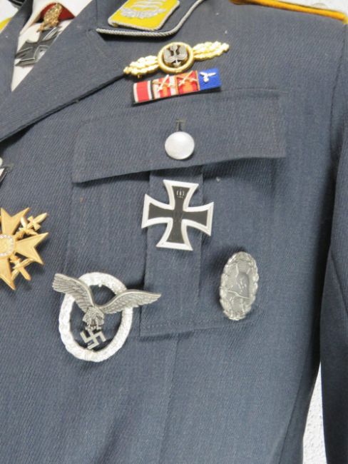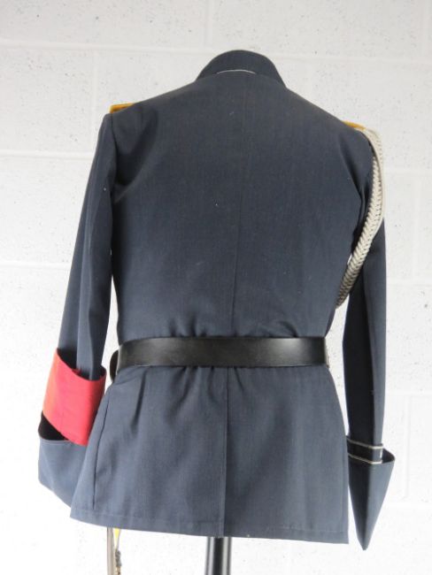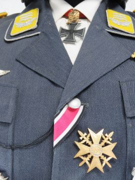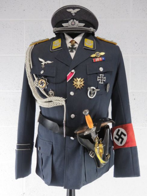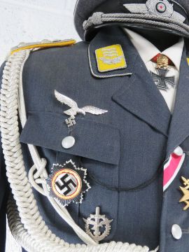 A museum quality reproduction Geschwader Richtofen Luftwaffe dress jacket with insignia, belt, holster and dress dagger to high ranking officer on stand.