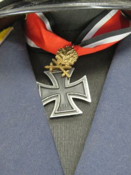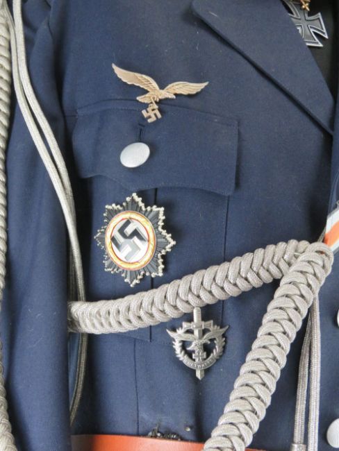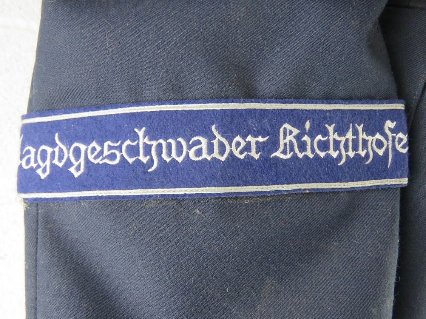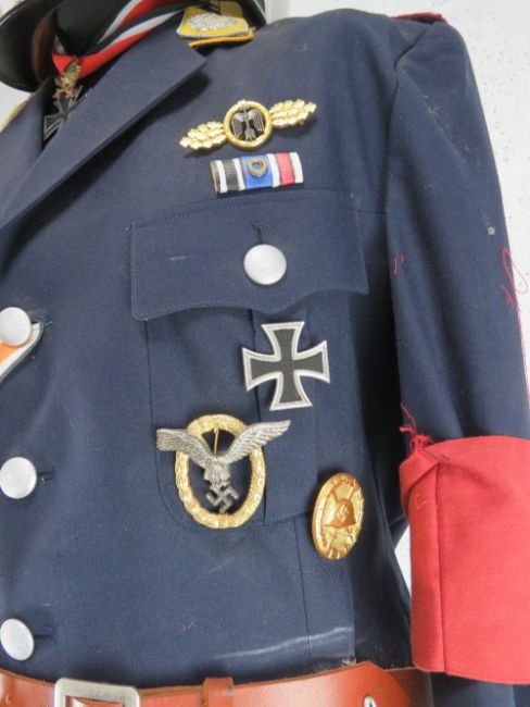 A museum quality reproduction Geschwader Richtofen Luftwaffe dress jacket with insignia, belt and holster to high ranking officer on stand.