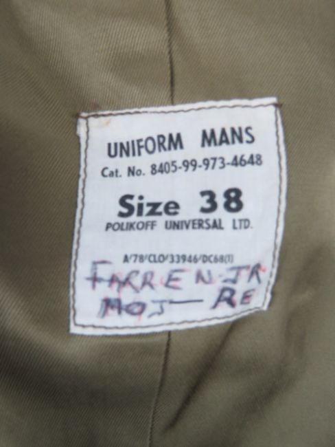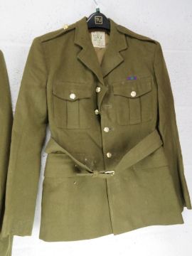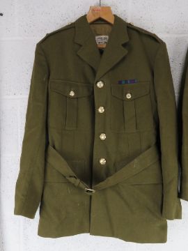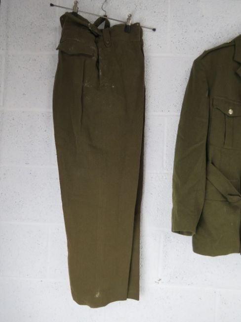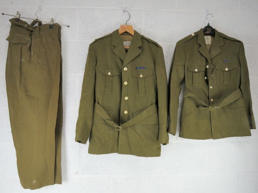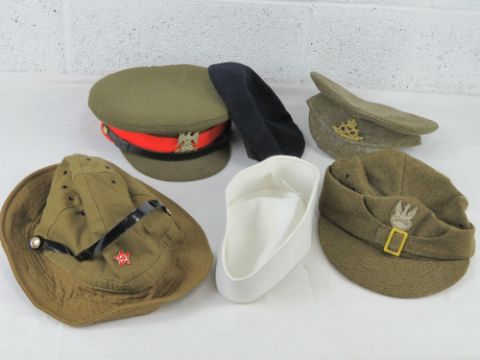 Two dress jackets sized 38, and 14, a pair of dress trousers size 45, officers caps, sailors cap, beanie cap, M43 cap, beret.