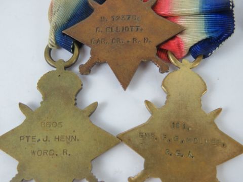 Five WWI British medals inc three 1914-15 medal for PTE J Henn Worcestershire Regiment 8605, GNR FF Holmes RGA 161 and C Elliott 12376 respectively, two Victory medals for GNR B Blanchard RD 2855 and PTE J Baxter Cheshire Regiment 019 respectively. Also a medal bar. Six items.