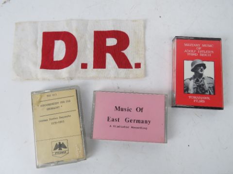 A quantity of reproduction Gewrman militaria; sidecap size 58, DR German armband, flags. Also three Cassettes of German Military Music