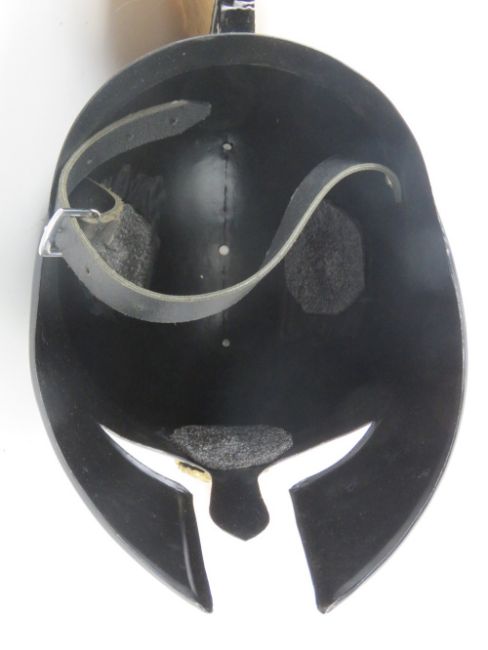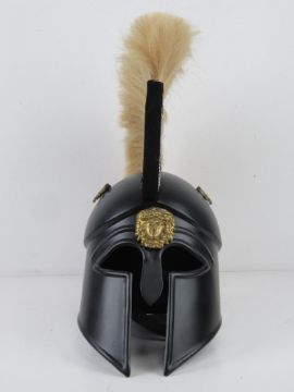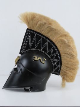 A reenactor or display piece Spartan helmet with natural coloured plume over.