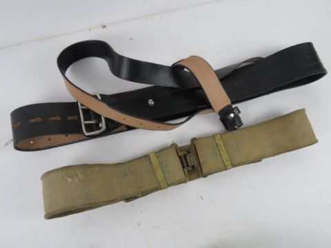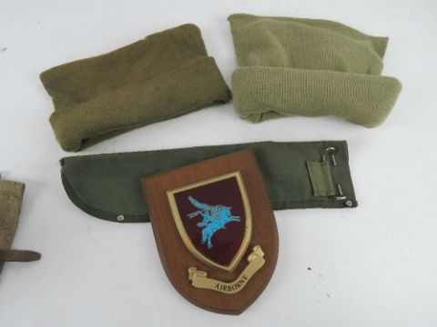 A quantity of assorted militaria; 2x British WWII Commando Cap. 1x pair British WWII Gaiters size 2. 1x WWII webbing belt.1x Black Sam Browne belt. 1x Royal Marines badged beret, size 57. 1x machete soft scabbard. 1 x British airborne plaque 7 ½ x 5 7/8 inches. 1x harmonica in box.