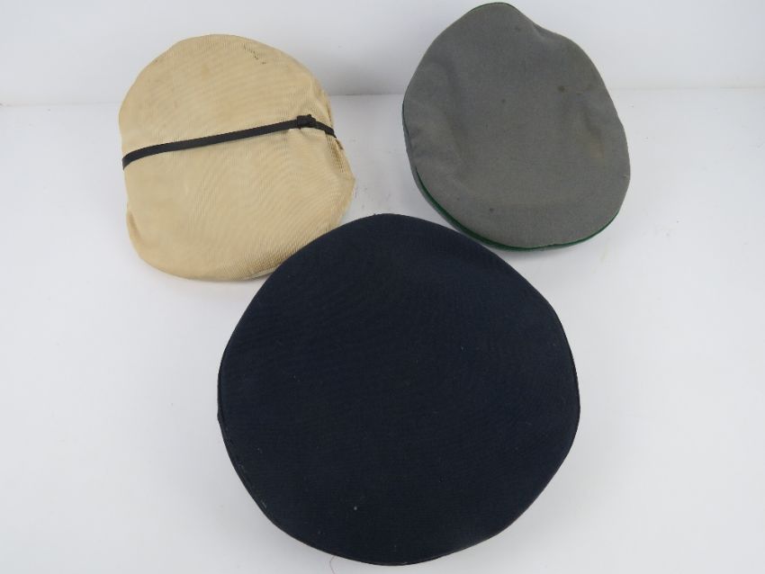 Three reproduction WWII caps being German Order Police crusher cap (Size 56), British Army (size 57) and a Kriegsmarine NCO.