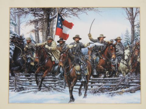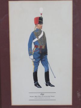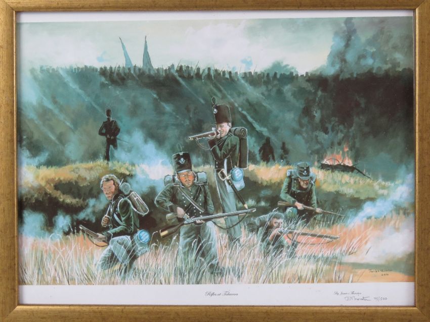 A framed print of Sergeant Major Royal Gloucestershire Hussars 1895 size 11 ½ x 17 ¾ inches. 1x framed print 'Rifles at Talavera' by Jamie Thornton, number 75 of 500, size 20 x 16 inches. 1x framed print '10th (Prince of Wales) Royal Hussars. Retreat on Corunna, 1808' by R. Simkin. 20 x 16 ¼ inches. 1x framed print 1831 Officer Rifle Brigade size 11 ½ x 17 ¾ inches. 1x unframed print of US Civil War Confederate Soldiers, size 16 x 12 inches.