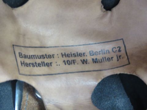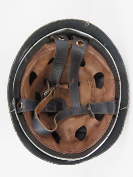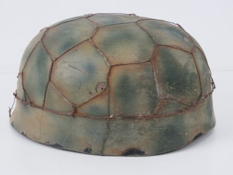 A reproduction WWII German Fallshirmjager (paratrooper) helmet with 'chicken wire' and leather liner.
